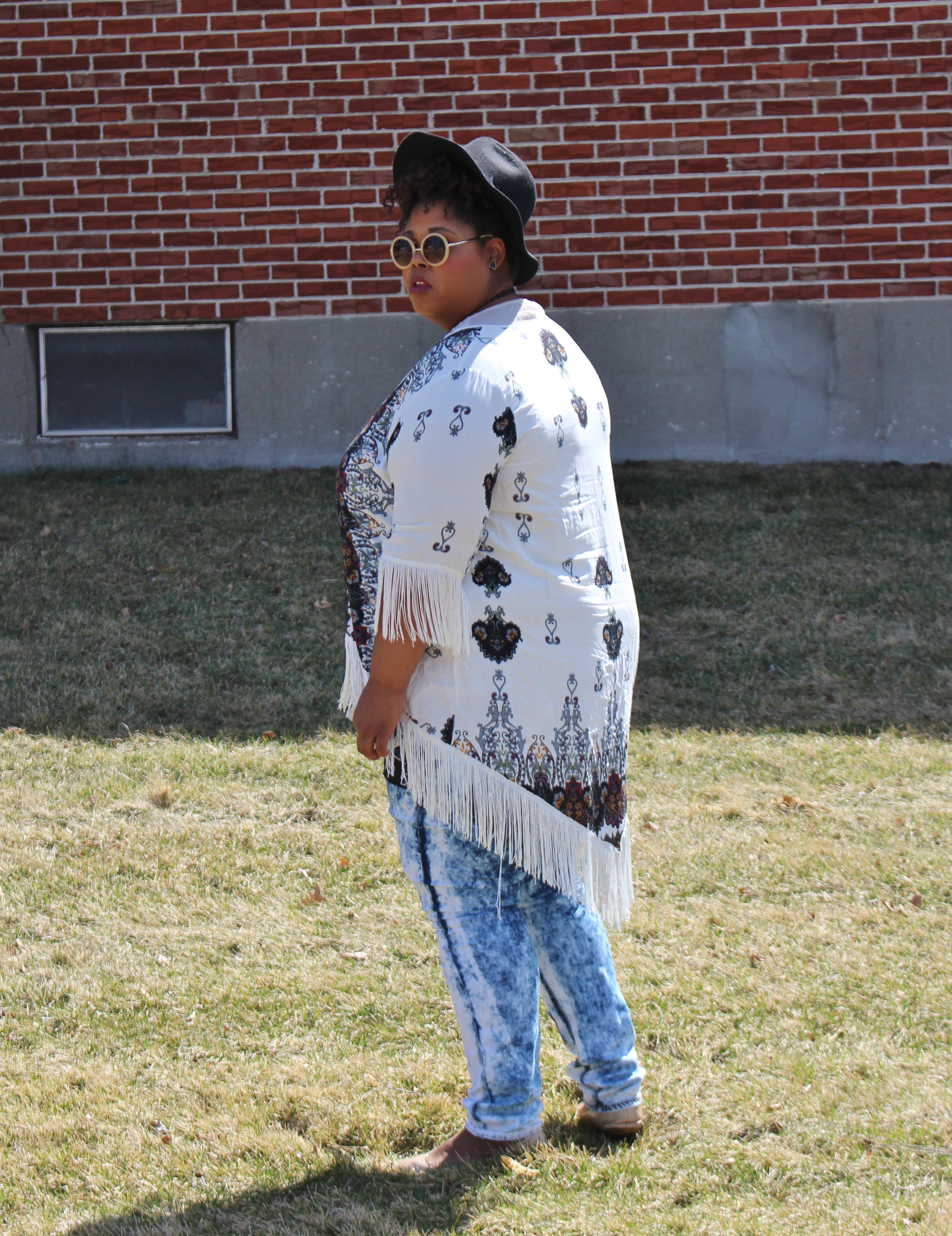 Junior plus size clothing is so unpredictable. I’ve ordered from these retailers before, but I suppose they carry multiple lines in-store; this means, I need to try stuff on to ensure the fit is right. I can usually eyeball if something is going to fit properly. However, I struggled to get these jeans over my thighs and the arms on this kimono are kind of tight. This is totally strange, considering I’ve not had issues ever before… So I ordered the kimono online, but I bought the jeans in-store by the way.