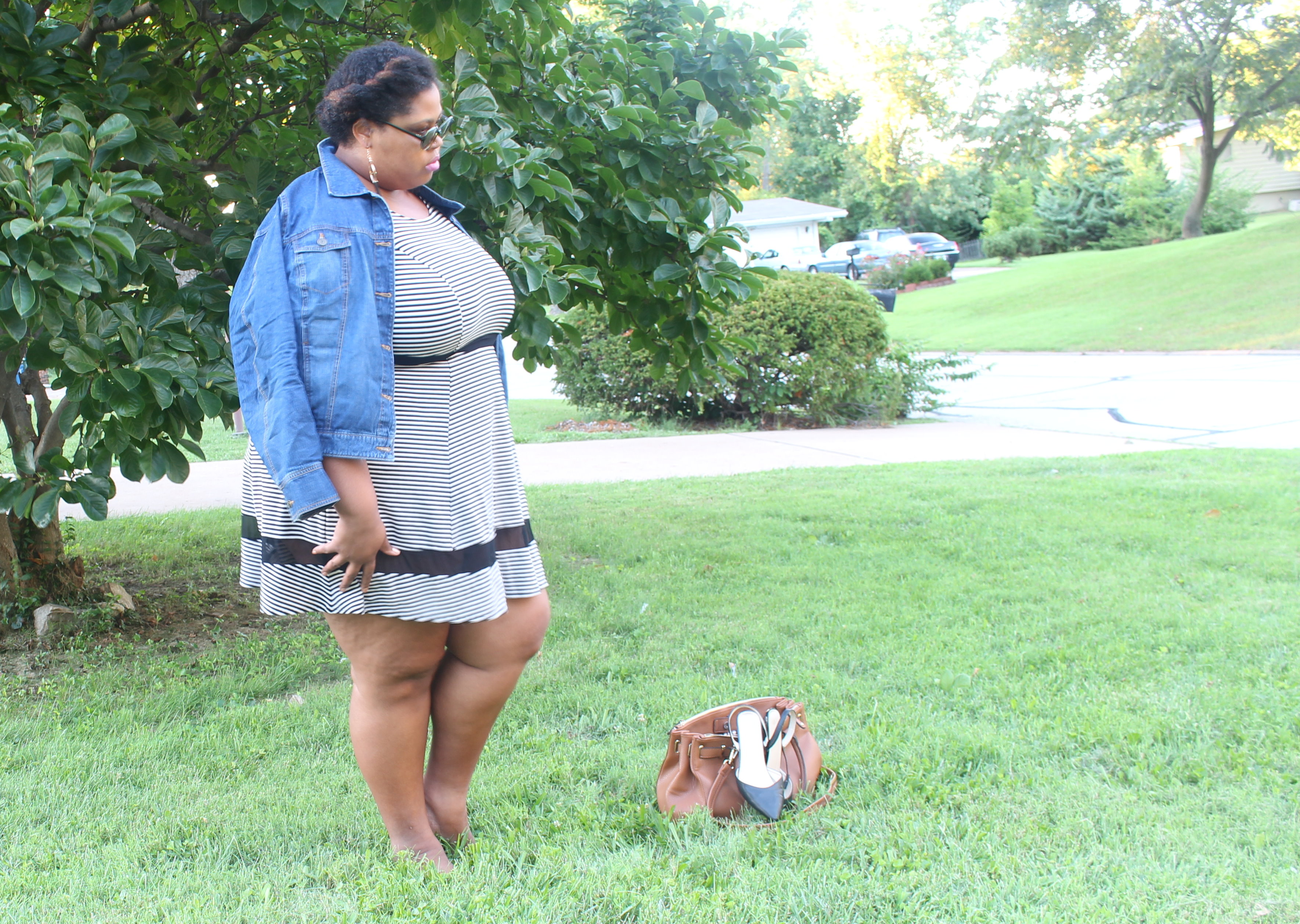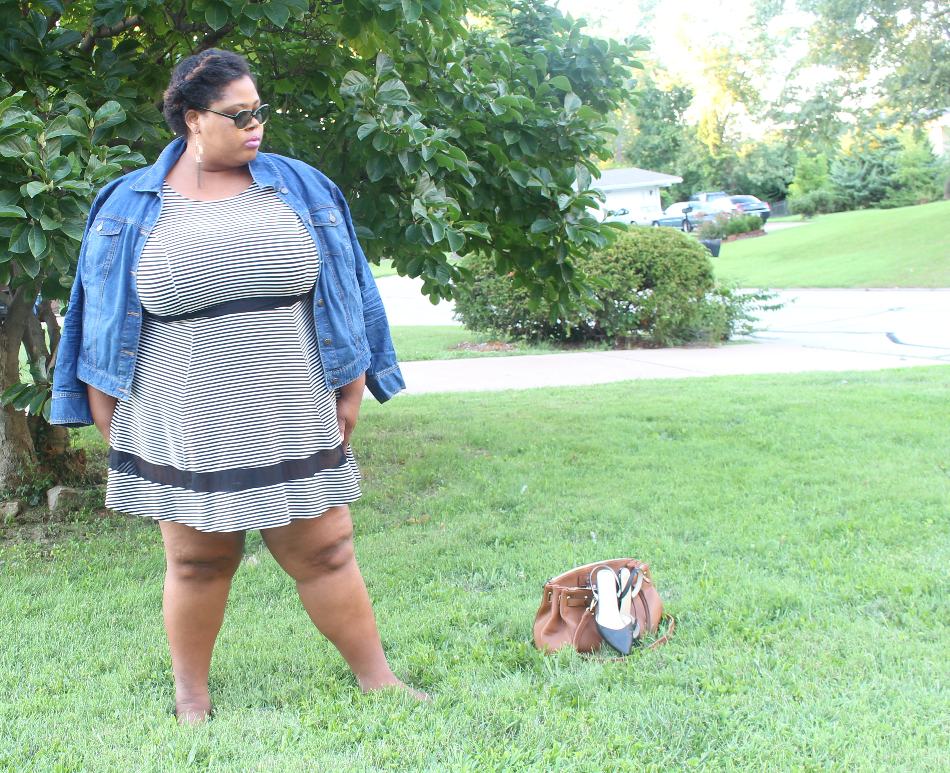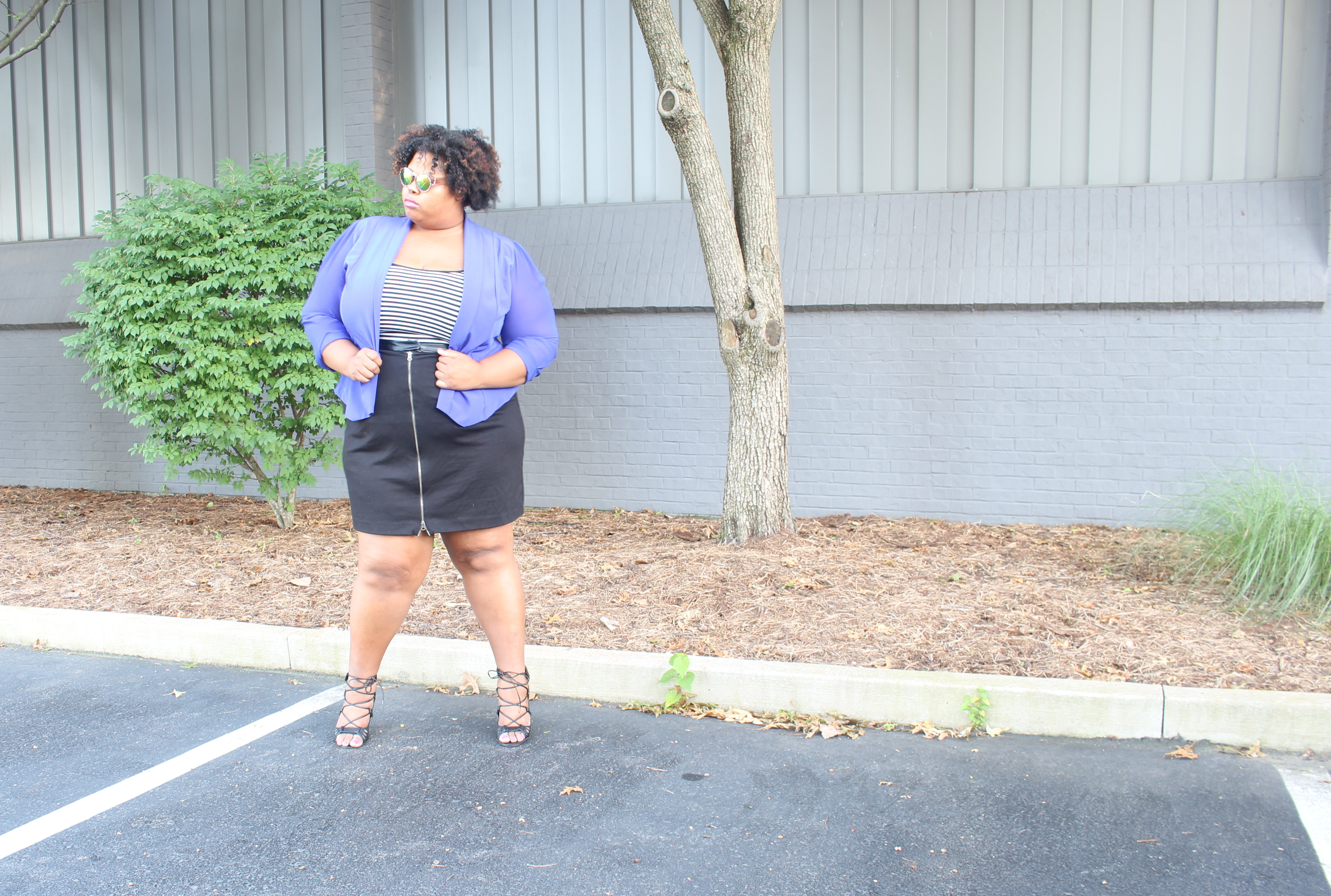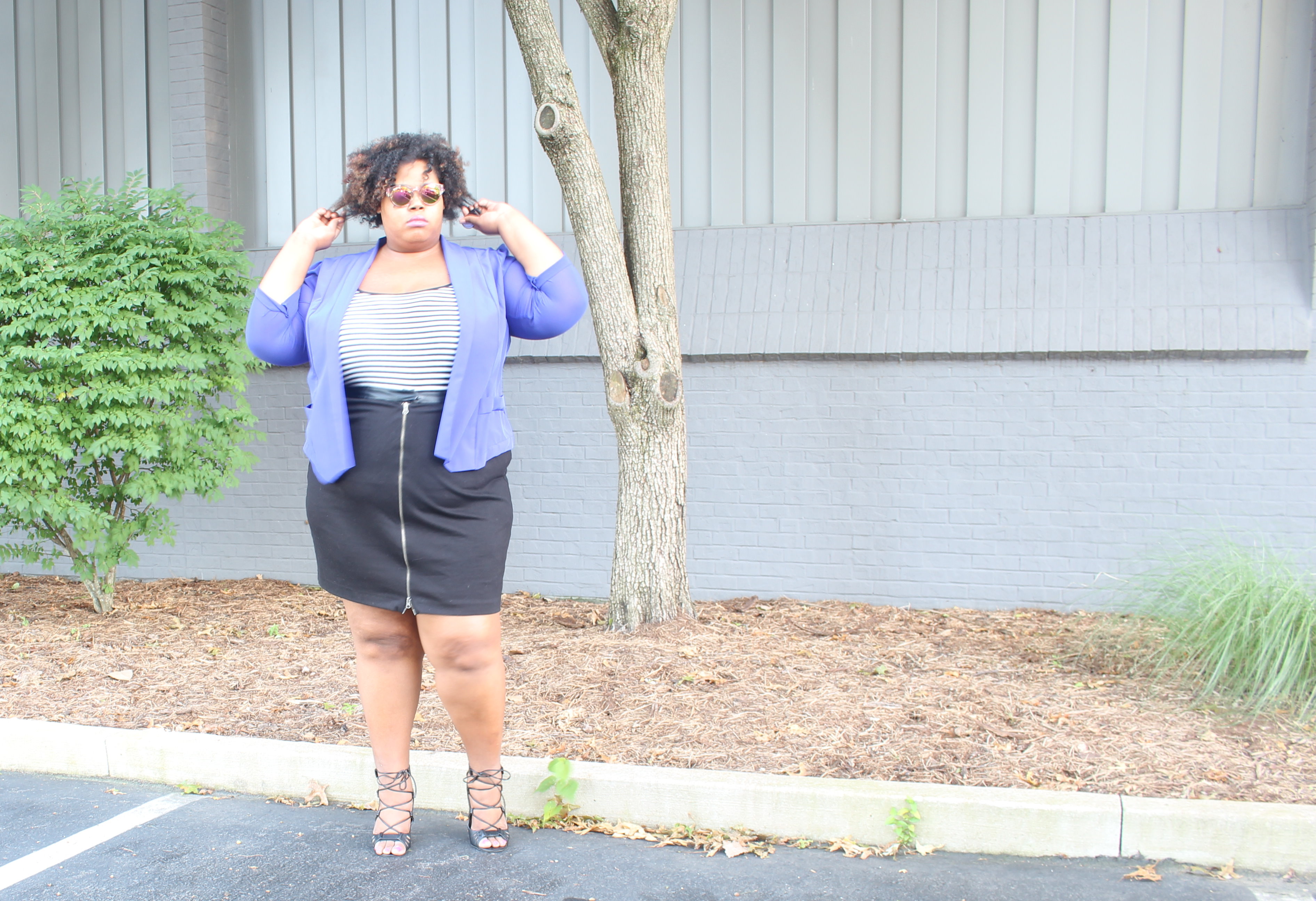 The blue blazer and black and white dress are from Gwynnie Bee. Everything else is old.