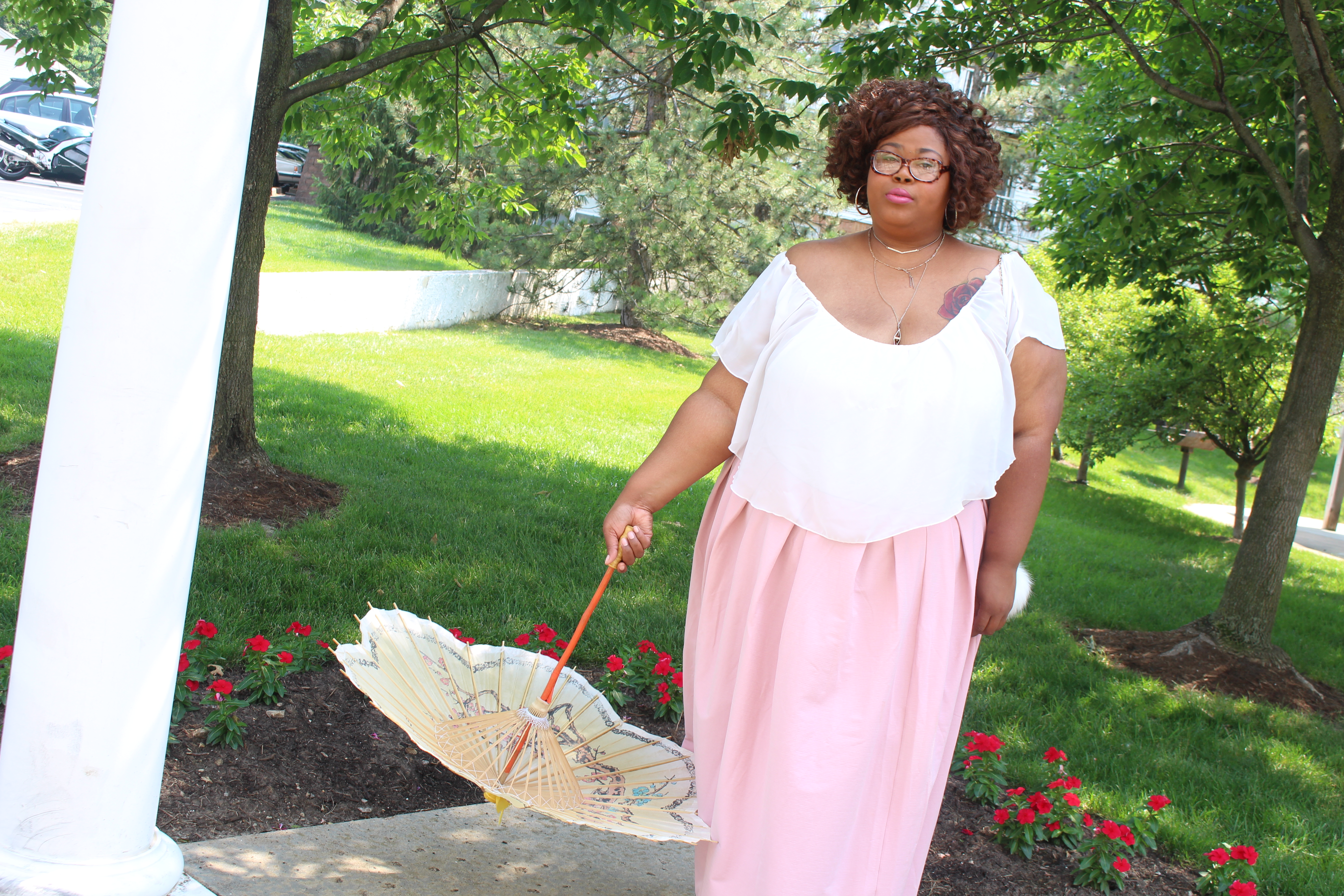 However, the mi sen scene was absolutely captivating, and I’m still here for that. I cannot say that this look was inspired by the film, but it’s ultra feminine (like the looks in the film) – a little off-the-shoulder action, a pink maxi and dainty brolly, sure.